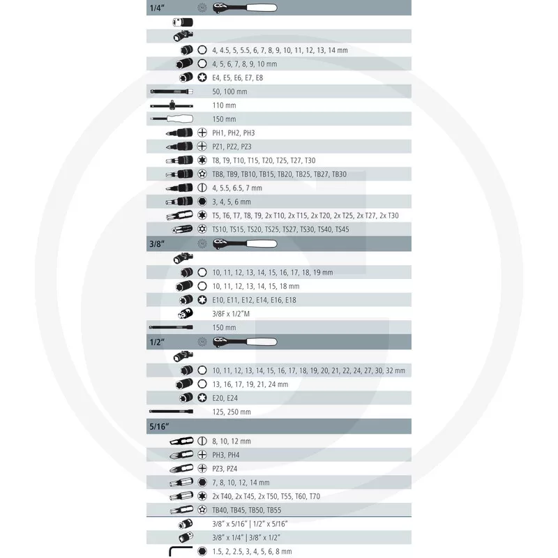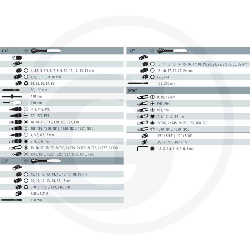 • 3/8" e-torx dugókulcs, E10, E11, E12, E14, E16, E18