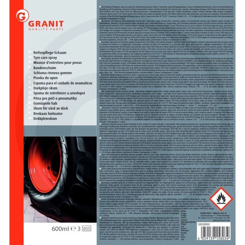 Kivitel: Abroncsápoló hab igénybe vett gumiabroncsok optikai feljavításához. Tisztítja, ápolja és védi a gumiabroncs oldalfalait. A speciális antisztatikus hatás késlelteti az újraszennyeződést.